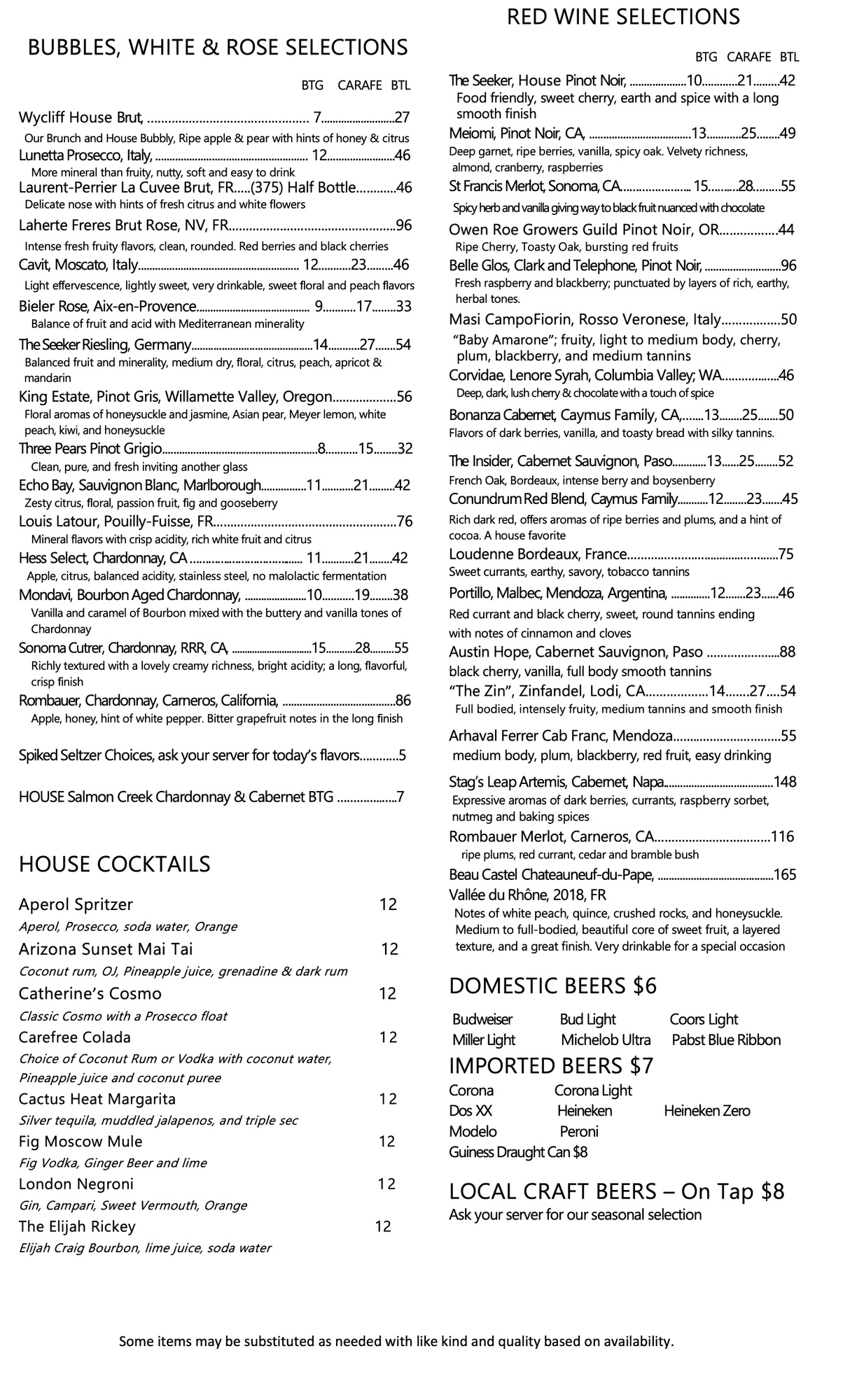 Happy Hour Daily 3pm - 6pm $4 Domestic Bottled Beer, $6 House Wine and House Made Sangria and $6 Well Drinks. Happy Hour Food until 5 pm. Sunday Brunch runs from 10am - 3pm and features $15 Bottomless Mimosas or $8 Bloody Mary's